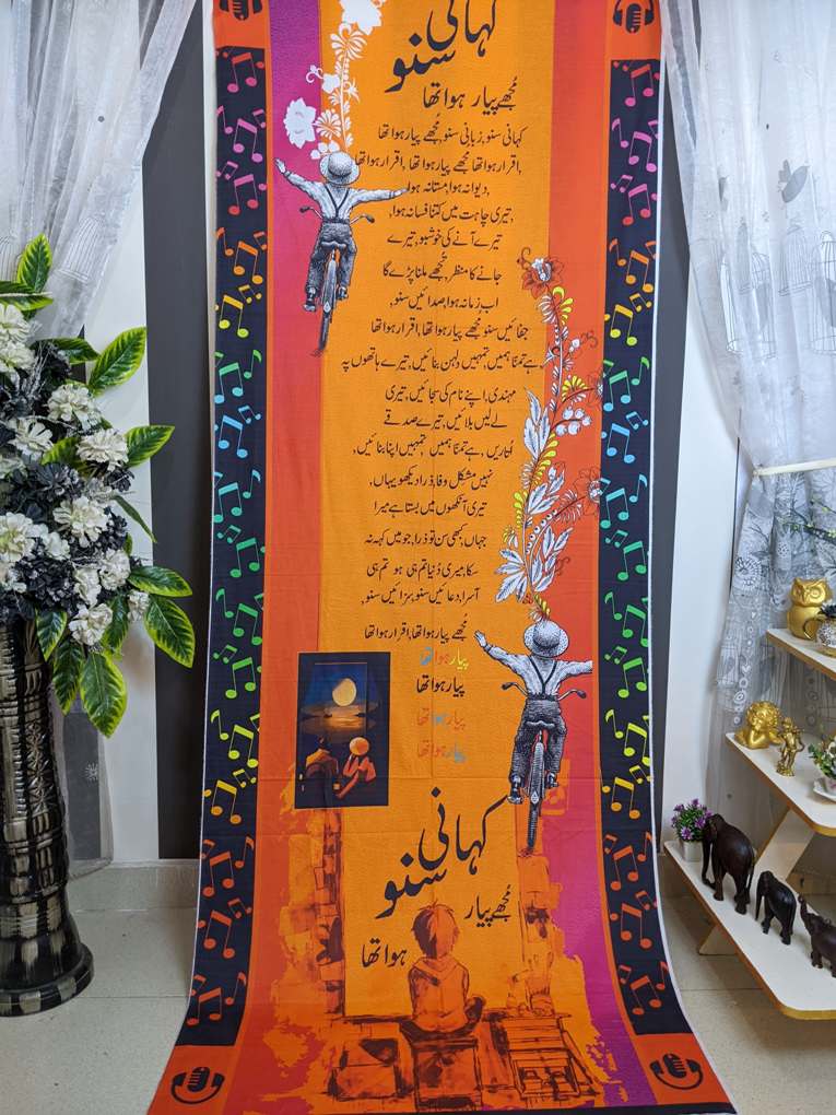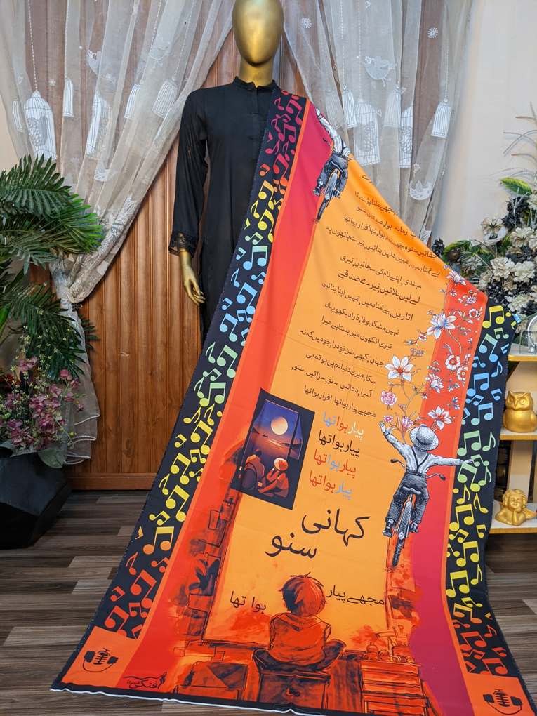 Celebrate the magic of storytelling with this poetic dupatta. Inspired by Kaifi Khalil’s “Kahani Suno,” this dupatta is a must-have. Immerse yourself in the world of poetry with this unique dupatta. Vibrant dupatta featuring a captivating poetic design. Eye-catching dupatta inspired by Kaifi Khalil’s “Kahani Suno.” Unique poetic design on a vibrant dupatta, perfect for poetry love. Show your love for poetry and Kaifi Khalil’s “Kahani Suno” with this beautiful dupatta