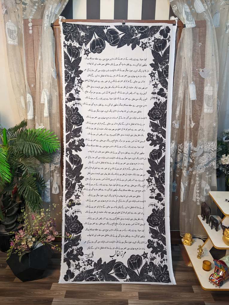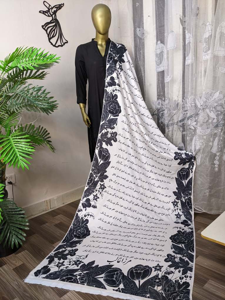 Celebrate your love for literature and culture with this unique printed dupatta featuring Mirza Ghalib’s timeless poetry. Expertly printed using advanced techniques, the elegant verses of Ghalib’s poetry are beautifully displayed on high-quality, soft fabric, making this dupatta a must-have for poetry enthusiasts and fashion lovers alike.