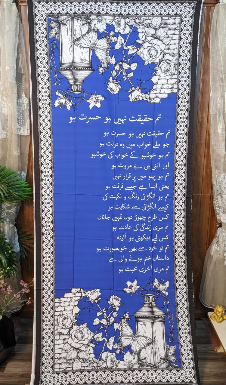 Let poetry drape your soul with the Funky Fiesta “Tum Haqeeqat Nahi Ho Hasrat Ho” Silk Dupatta. This exquisite blue dupatta celebrates the charm of Urdu poetry, blending literary elegance with luxurious silk fabric. The intricate black-and-white floral border and vintage lantern motifs frame the verse beautifully, making it an artistic statement piece for every occasion.