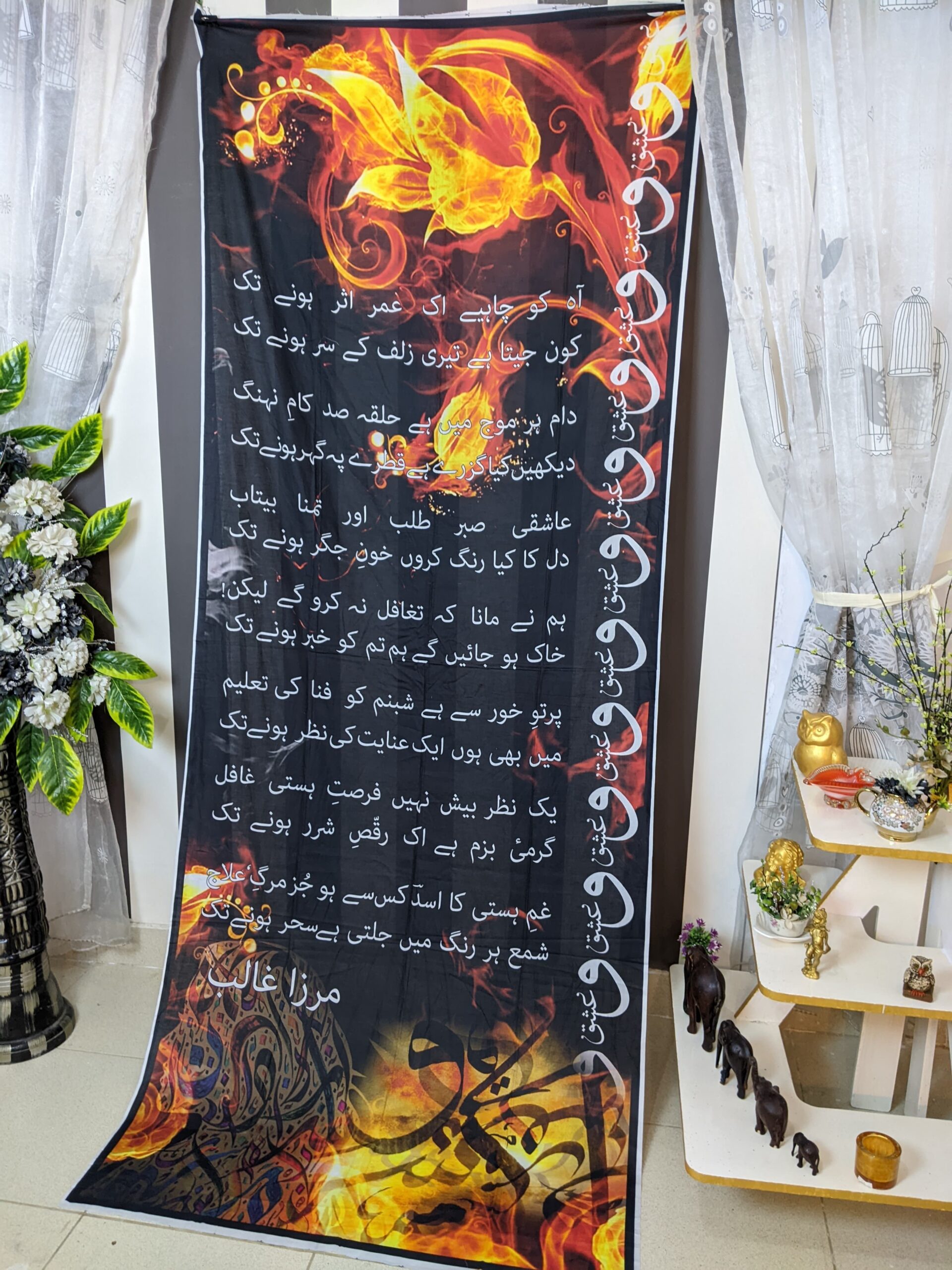 - Vibrant red and black colours with bold calligraphy featuring Ghalib’s poetry.